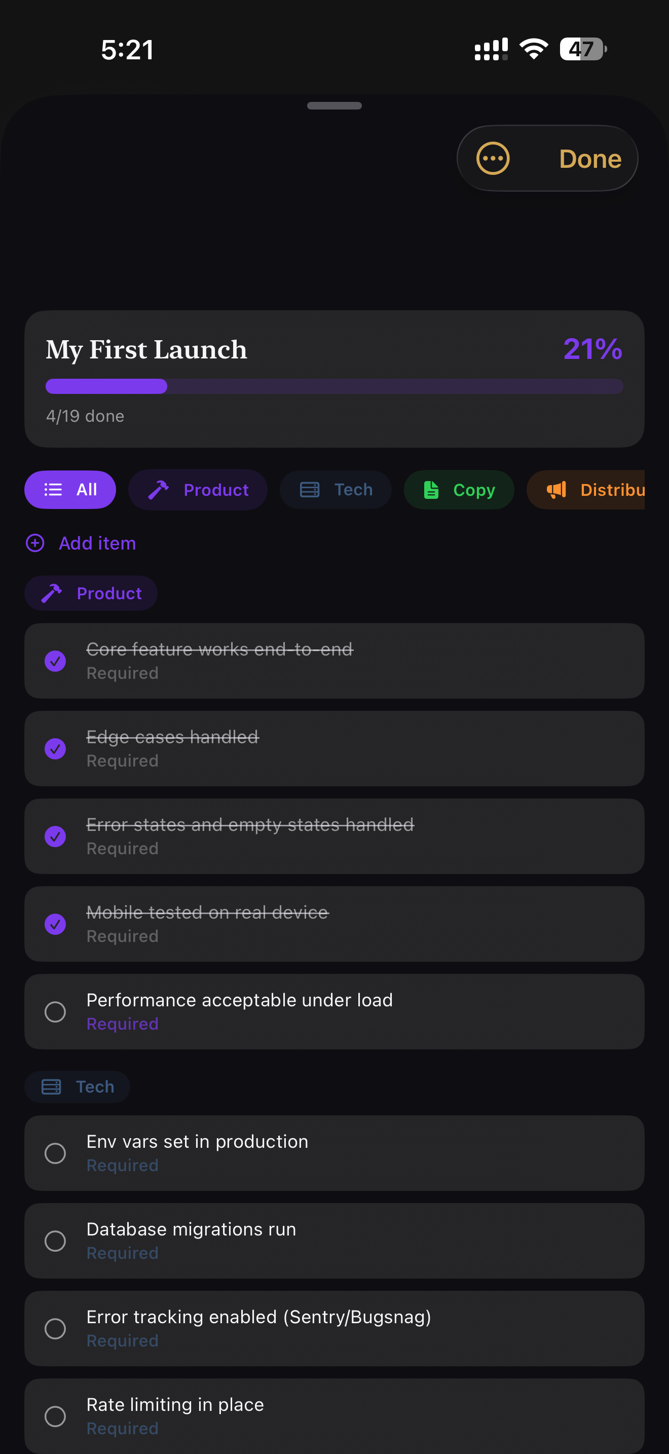 Track every launch step from final polish to post-ship follow-up without losing the thread.