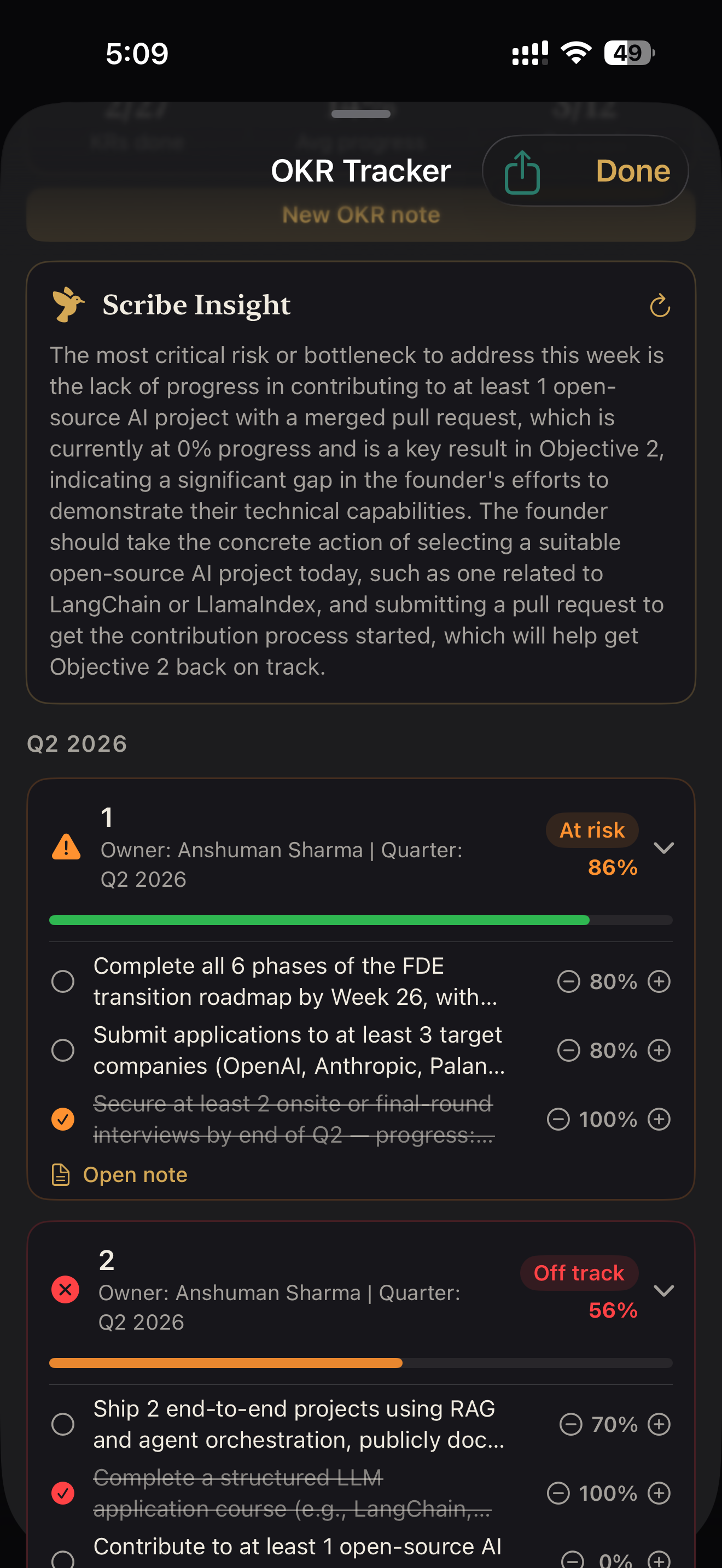 We built Scholium on that idea: Scribe in the margins — not replacing judgment, helping you recover it while you pitch, blueprint, track OKRs, or ship.