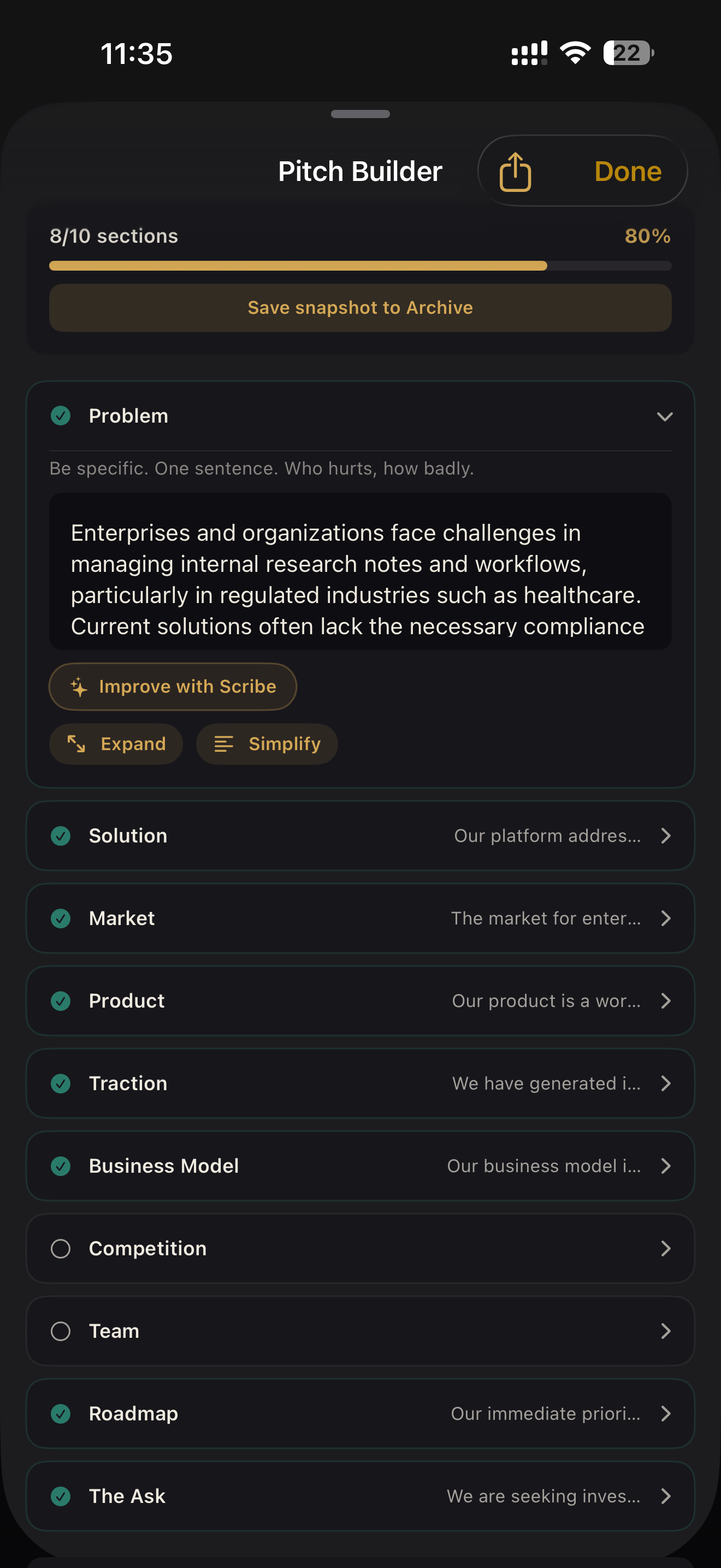 Draft your narrative, traction story, and investor-ready pitch in one connected workspace.