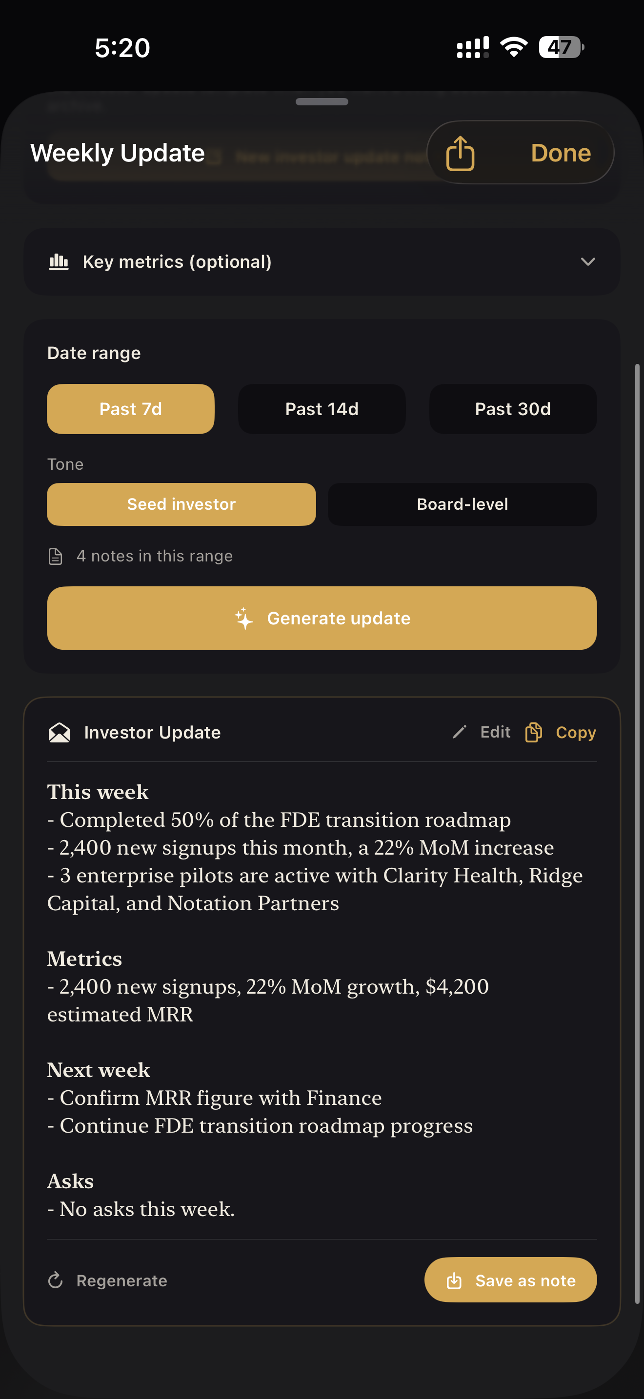 "Investor prep used to mean rereading fifty notes. Now I ask once and get the through-line."